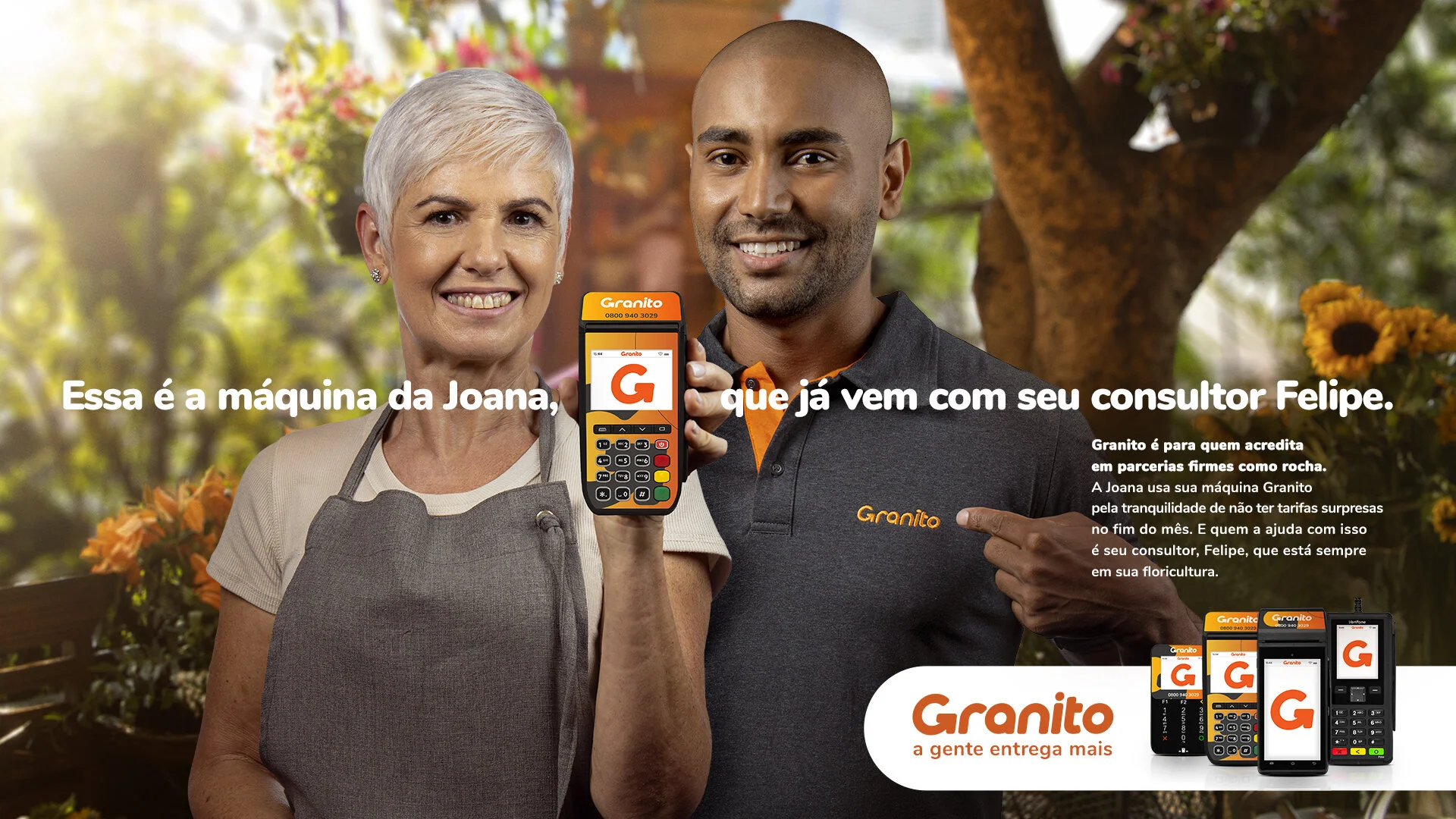 Granito is for those who believe in rock-solid partnership, Joana uses her Granito payment machine for the peace of mind she gets at the end of the month by not encountering surprise rates. And who got together in her right hand, is his consultant, Felipe, who is always at her flower shop.