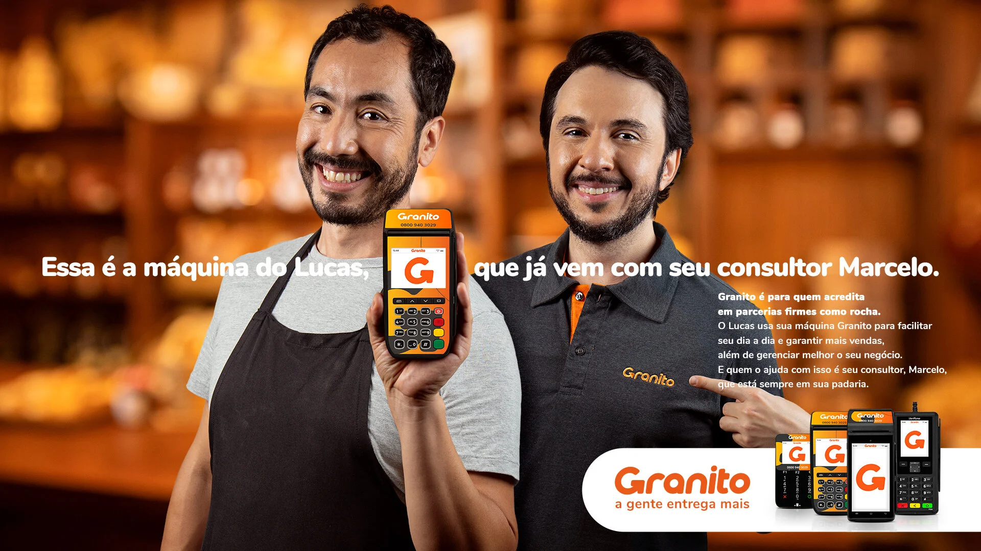 Granito is for those who believe in rock-solid partnership, Lucas uses his Granito payment machine to make his day-to-day easier. In addition, he guarantees more sales and boosts his business. And who got together in his right hand, is his consultant, Marcelo, who is always at his bakery.