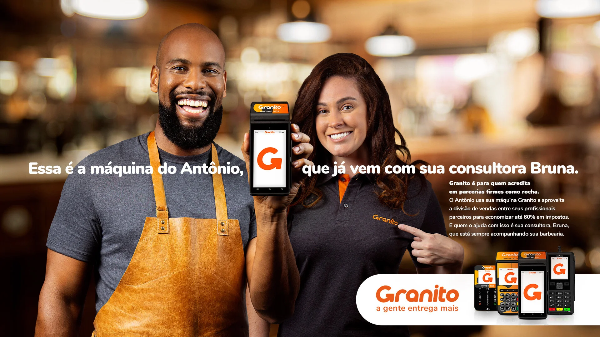 Granito is for those who believe in rock-solid partnership. Antonio uses his Granito payment machine and takes advantage of the sales division between his professional partners to save up 60% in taxes. And who got together in her right hand, is her consultant, Bruna, who is always at his barbershop.